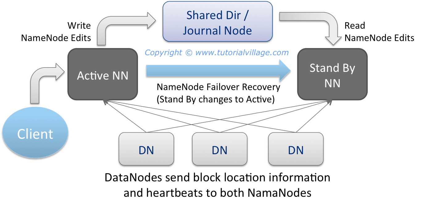In order to provide a HOT back-up and consistent solution for NameNode failure, a concept of using two NameNodes (one Active and one StandBy) was introduced. The below diagram describes the architecture of HDFS high availability.